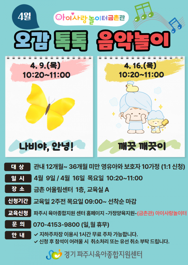 | 장소 | 금촌어울림센터1층, 교육실A | 대상 | 파주시 거주 12개월~36개월 미만 영유아와 보호자 |
