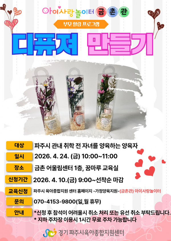 | 장소 | 금촌어울림센터 1층, 꿈마루 교육실 | 대상 | 파주시 거주 미취학 자녀를 양육하는 양육자 |