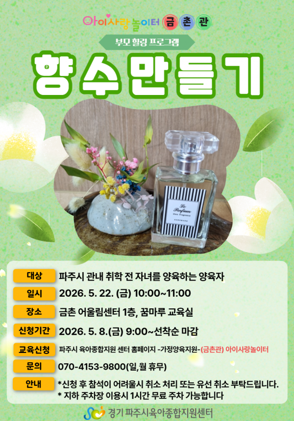 | 장소 | 금촌어울림센터 1층, 꿈마루 교육실 | 대상 | 파주시 관내 미취학 자녀를 양육하는 양육자 |