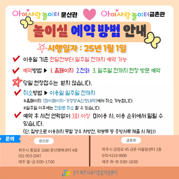 | 장소 | 아이사랑놀이터 금촌관(금촌 어울림센터 1층) | 대상 | 파주시 관내 12개월~미취학 영유아와 보호자 |