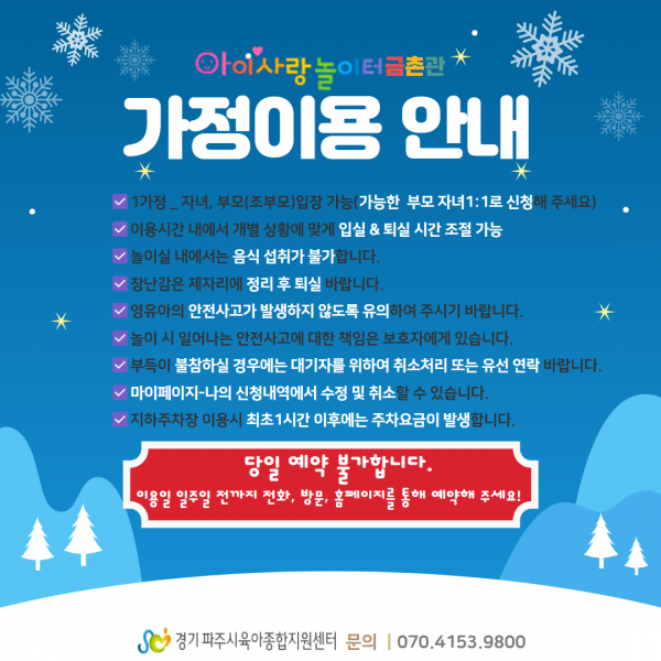 | 장소 | 아이사랑놀이터 금촌관(금촌 어울림센터 1층) | 대상 | 파주 관내 12개월~미취학 영유아와 보호자 |