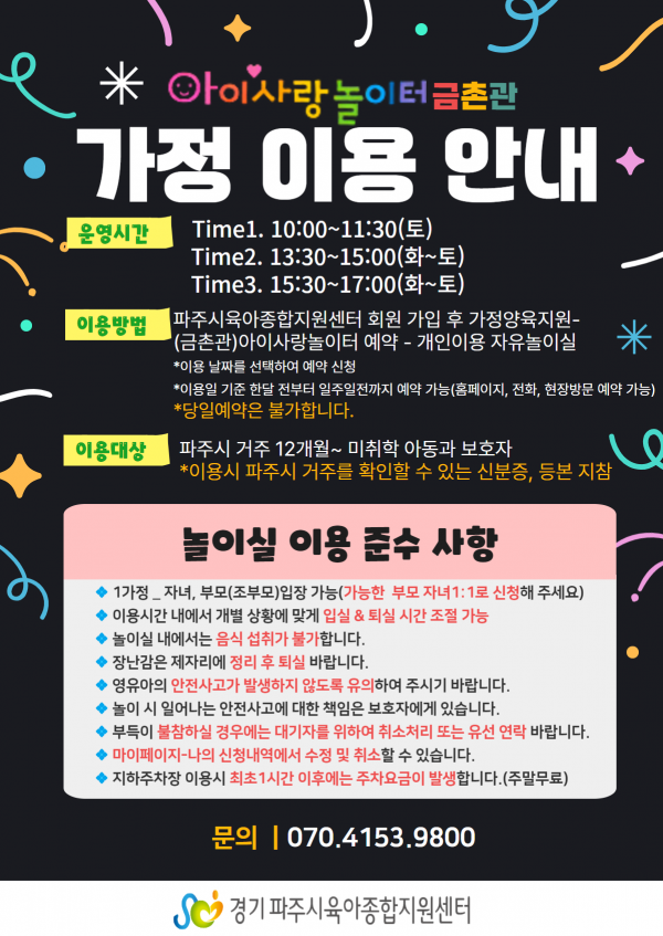 | 장소 | 아이사랑놀이터 금촌관(금촌 어울림센터 1층) | 대상 | 파주시 관내 12개월~미취학 영유아와 보호자 |