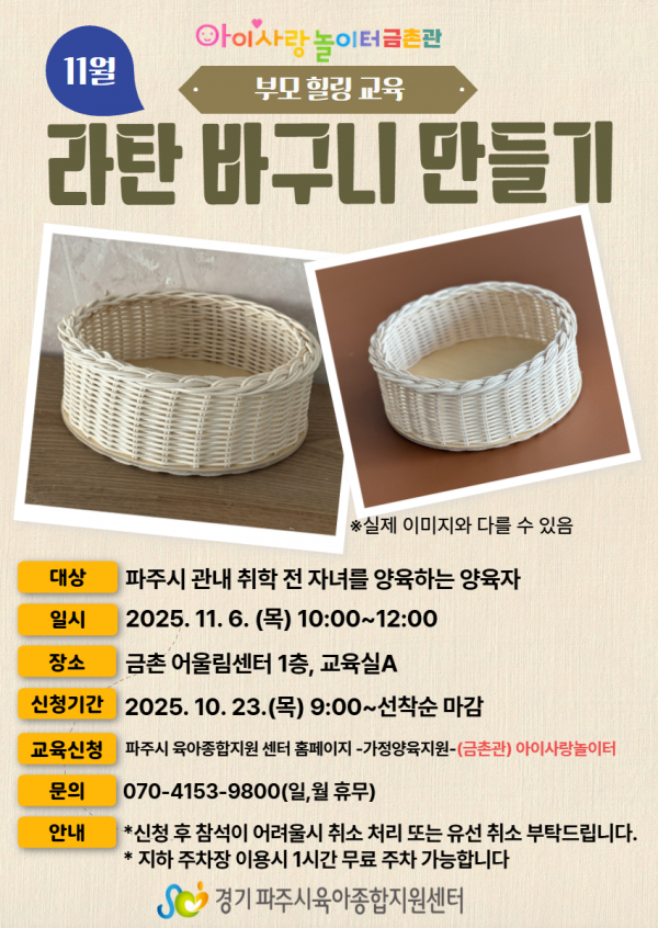 | 장소 | 금촌어울림센터 1층, 교육실A | 대상 | 파주시 관내 취학 전 아동을 양육하는 양육자 |