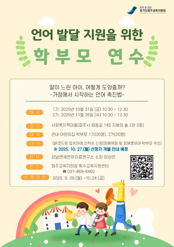 공지 '언어 발달 지원'을 위한 학부모 연수 페이지 정보 작성자 관리자 댓글 0건 조회 196회 작성일 25-09-25 16:57 목록 본문 많은 참여 바랍니다. 이전글2025년 파주시 어린이·사회복지급식관리지원센터 9월 파주웹진 25.09.26 다음글영유아 "양육실천 및 발달지원" 사례 공모전 25.09.25