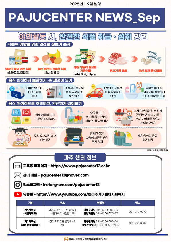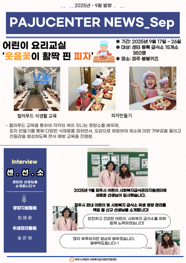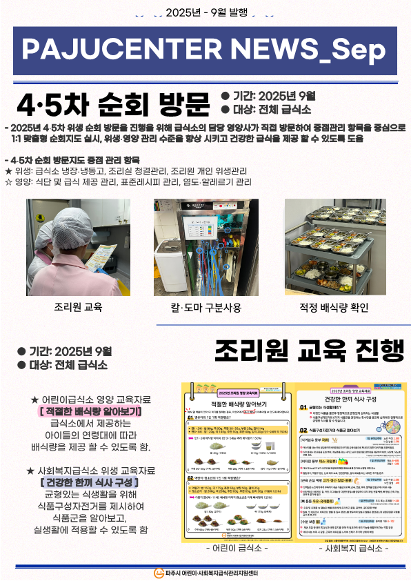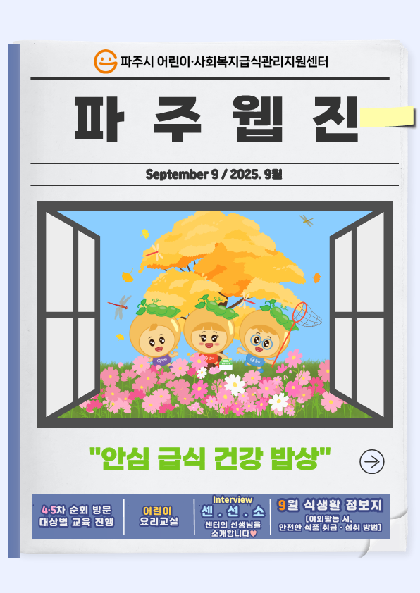 파주시 2025년 파주시 어린이·사회복지급식관리지원센터 9월 파주웹진 페이지 정보 작성자 관리자 댓글 0건 조회 167회 작성일 25-09-26 10:45 목록 첨부파일 붙임. 2025년 9월 파주웹진 1부..pdf (11.8M) 0회 다운로드 | DATE : 2025-09-26 10:45:50 본문 2025년 파주시 어린이·사회복지급식관리지원센터 9월 파주웹진 이전글10월 공통 슬로건 캠페인 25.09.29 다음글'언어 발달 지원'을 위한 학부모 연수 25.09.25