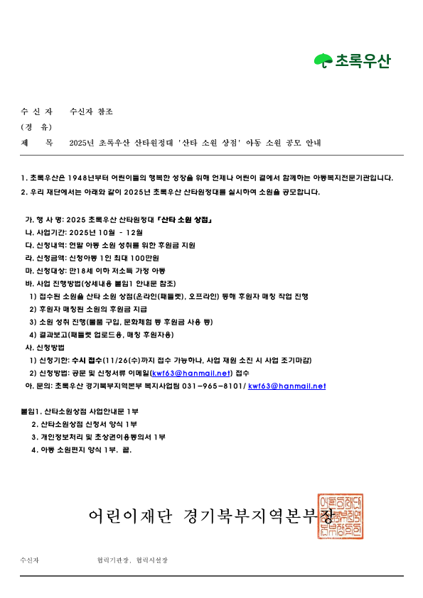 파주시 2025년 초록우산 산타원정대 '산타 소원 상점' 아동 소원 공모