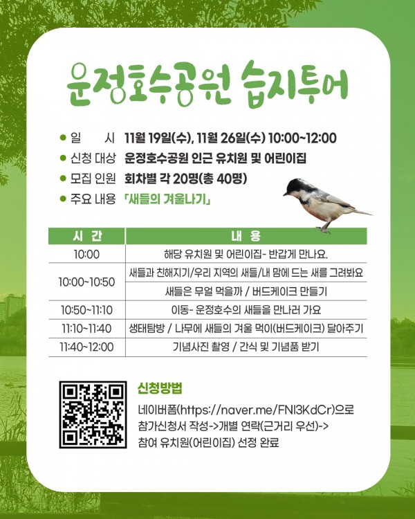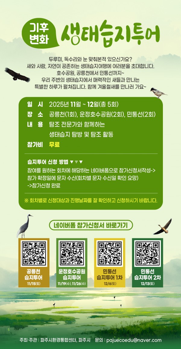 공지 생태 체험 <운정호수공원 습지투어 및 생태습지투어> 페이지 정보 작성자 관리자 댓글 0건 조회 44회 작성일 25-11-04 10:29 목록 첨부파일 2025년 기후변화 생태습지투어 계획안_공유.pdf (2.7M) 0회 다운로드 | DATE : 2025-11-04 10:29:53 본문 기관(어린이집 및 유치원) 대상 : 11월 19일 , 11월 26일 10:00~ 12:00 가족 대상 : 11월 15일, 12월 6일, 12월 13일 참가비 : 무료시간과 내용 확인하셔서 많은 참여 바랍니다. 다음글파주시 워크온 걷기챌린지 리워드 지급방식 변경 알림 25.10.30