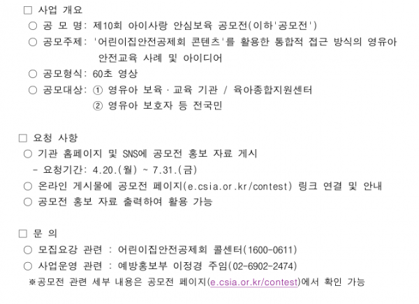 기타 ⌜제10회 아이사랑 안심보육 공모전⌟ 페이지 정보 작성자 관리자 댓글 0건 조회 9회 작성일 26-04-17 13:42 목록 본문 제10회 아이사랑 안심보육 공모전파일을 확인하여 주세요~ 다음글2026 장애영·유아 조기발견 및 지원을 위한 어린이집 원장 연수 운영 계획 26.04.09