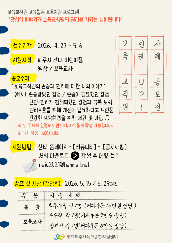 센터 보육교직원 보육활동 보호지원 프로그램 '2026년 보육교직원 인권 UP' 사례 공모 사업 안내 및 서식 페이지 정보 작성자 관리자 댓글 0건 조회 4회 작성일 26-04-27 18:00 목록 첨부파일 [서식] 2026년 보육교직원 인권 UP 사례공모전.hwp (276.5K) 2회 다운로드 | DATE : 2026-04-27 18:00:11 본문 보육교직원 인권을 위한 수기 공모사업을 진행합니다^^많은 관심과 참여 부탁드려요~^^ 다음글2026년 파주시육아나눔터 추가 모집 안내 및 선정결과 공고 26.04.24