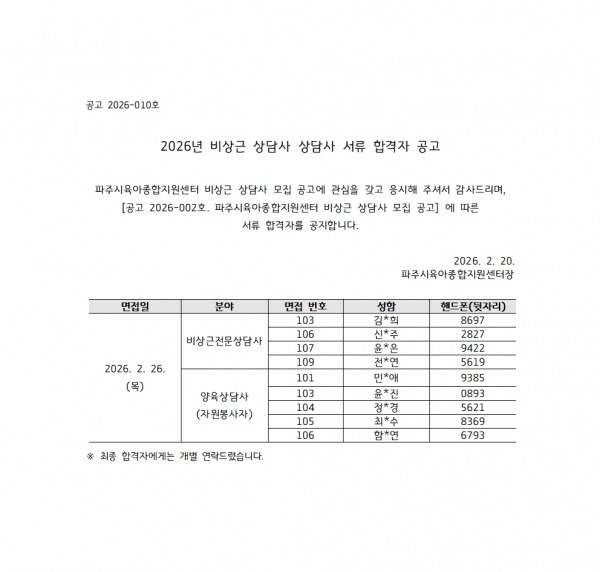 [공고 2026-010호] 2026년 파주시육아종합지원센터 비상근상담사 서류 합격자 공고 페이지 정보 작성자 관리자 댓글 0건 조회 43회 작성일 26-02-20 13:23 목록 본문 이전글[공고 2026-012호] 2026년 파주시육아종합지원센터 비상근 컨설턴트 서류 합격자 공고 26.02.20 다음글[공고 2026-009호] 파주시육아종합지원센터 직원채용 공고 (보육전문요원) 26.02.09