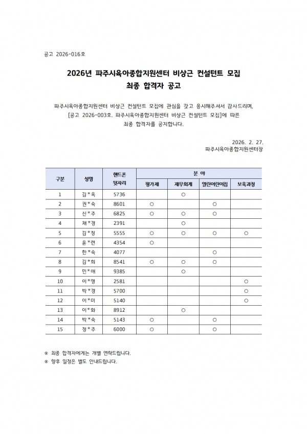 [공고2026-016호] 2026년 비상근 컨설턴트 모집 최종 합격자 공고 페이지 정보 작성자 관리자 댓글 0건 조회 307회 작성일 26-02-27 19:09 목록 본문 향후 일정은 개별 안내드립니다. 이전글[공고 2026-016호] 2026년 파주시육아종합지원센터 직원채용 서류합격자 공고 (월급형 대체교사) 26.03.09 다음글[공고2026-015호] 2026년 파주시육아종합지원센터 비상근 상담사 모집 최종 합격자 공고 26.02.27