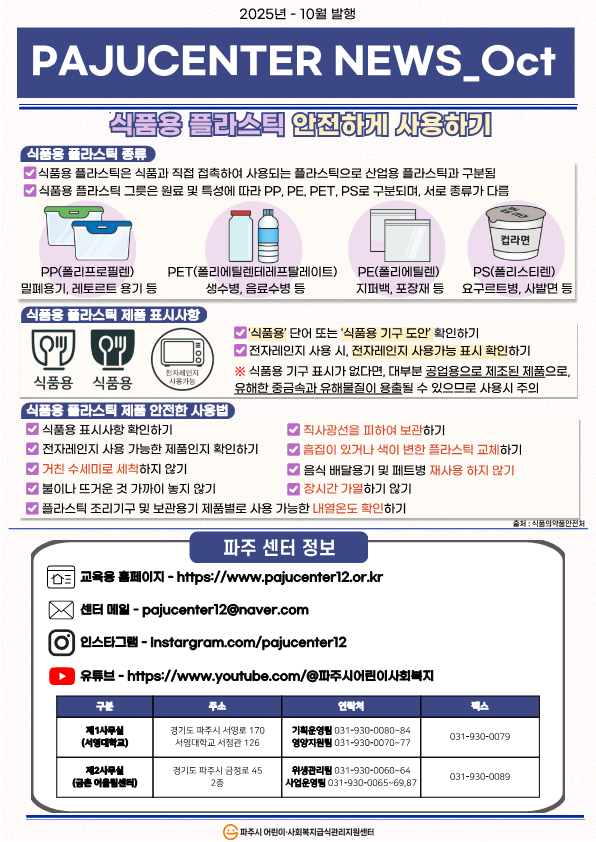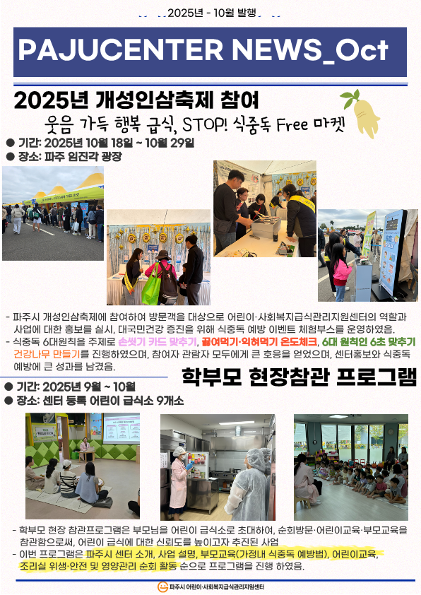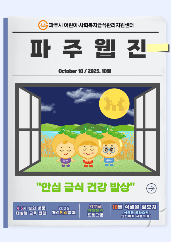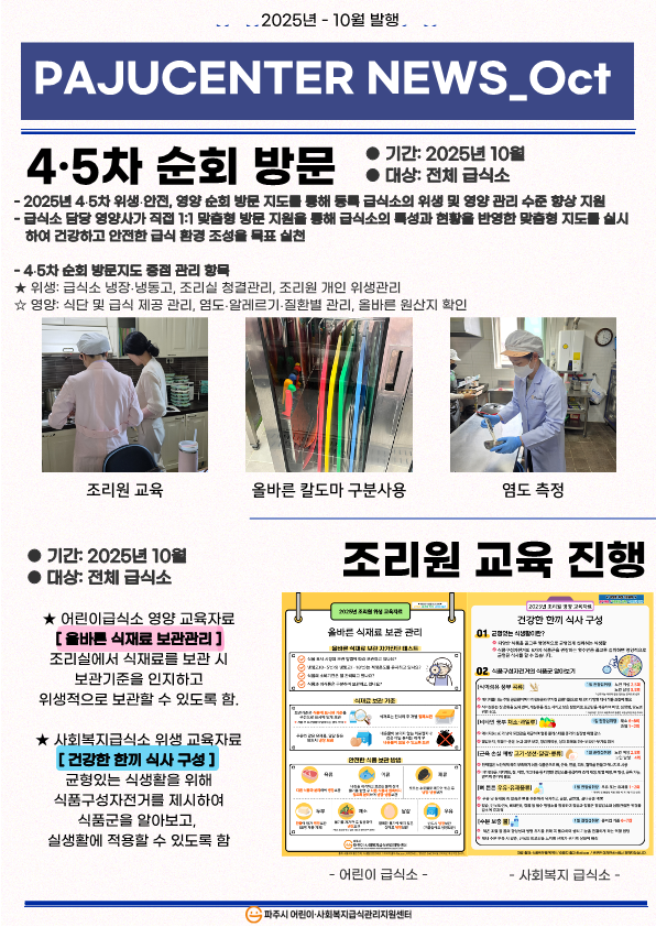 공지 2025년 파주시 어린이·사회복지급식관리지원센터 10월 파주웹진 페이지 정보 작성자 관리자 댓글 0건 조회 22회 작성일 25-10-30 17:52 목록 본문 2025년 파주시 어린이·사회복지급식관리지원센터 10월 파주웹진 안내드립니다. 다음글11월 식단 및 표준 레시피 안내 25.10.14