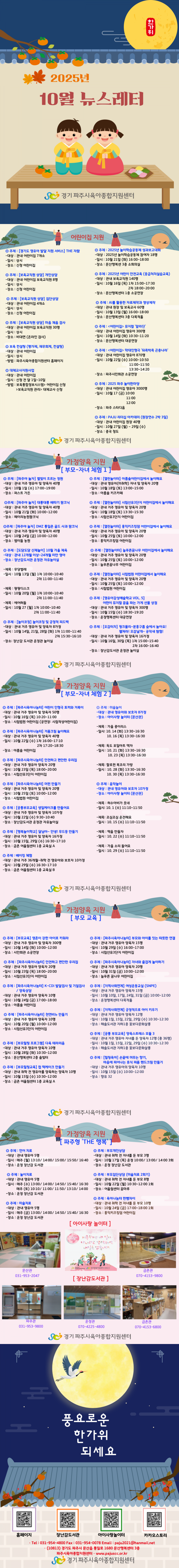 뉴스레터 2025년 10월 뉴스레터 페이지 정보 작성자 관리자 댓글 0건 조회 222회 작성일 25-09-29 09:41 목록 본문 2025년 10월 뉴스레터 이전글파주시육아종합지원센터 장난감도서관운정관, 전국 우수기관 선정 25.10.01 다음글2025년 9월 뉴스레터 25.08.25