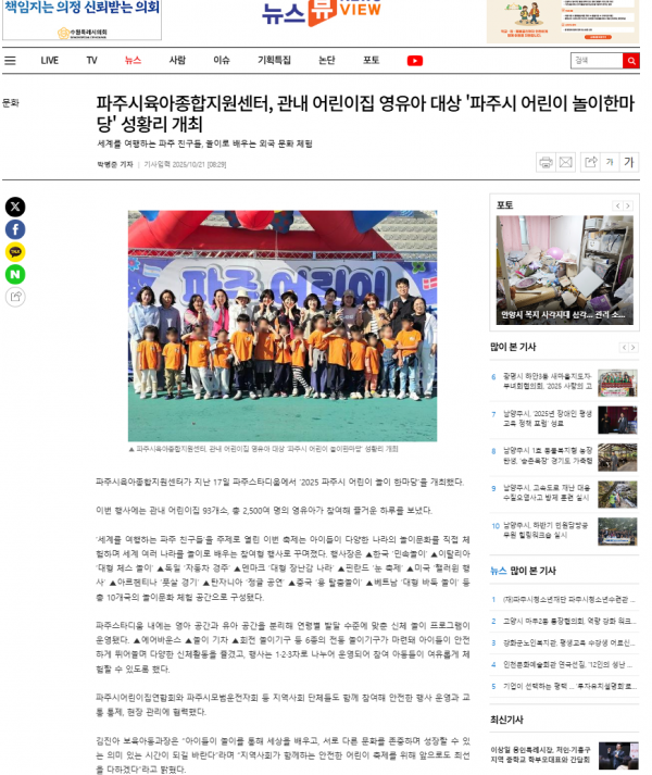 보도자료 파주시육아종합지원센터, 관내 어린이집 영유아 대상 '파주시 어린이 놀이한마당' 성황리 개최 페이지 정보 작성자 관리자 댓글 0건 조회 119회 작성일 25-11-07 11:33 목록 본문 2025. 10. 21. 뉴스뷰, 파주시육아종합지원센터, 관내 어린이집 영유아 대상 '파주시 어린이 놀이한마당' 성황리 개최 이전글아이들의 행복을 함께 키우는 더 큰 파주 25.11.18 다음글2025년 11월 뉴스레터 25.10.30
