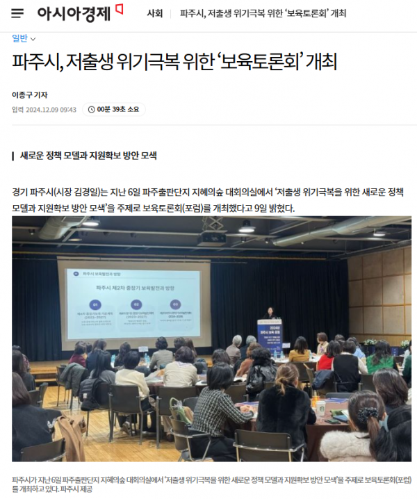 보도자료 파주시, 저출생 위기극복을 위한 '보육토론회' 개최 페이지 정보 작성자 관리자 댓글 0건 조회 47회 작성일 25-11-18 14:33 목록 관련링크 https://view.asiae.co.kr/article/2024120909435727123 25회 연결 본문 2024. 12. 19. 아시아경제, 파주시 저출생 위기극복을 위한 '보육토론회' 개최 이전글2025년 12월 뉴스레터 25.11.24 다음글파주시육아종합지원센터, 장난감도서관 재정비로 육아 지원 확대 25.11.18