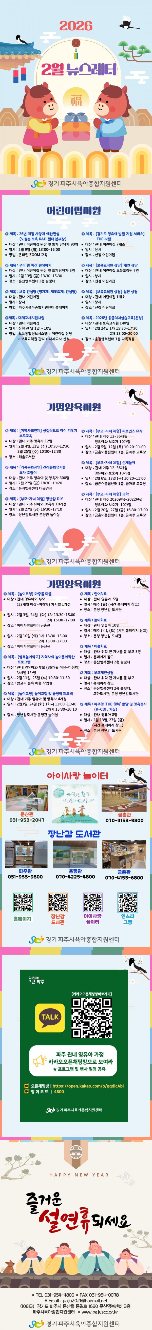 뉴스레터 2026년 2월 뉴스레터 페이지 정보 작성자 관리자 댓글 0건 조회 261회 작성일 26-01-22 11:06 목록 본문 2026년 2월 뉴스레터 이전글영유아와 함께 가기 좋은 곳 '아이사랑놀이터 문산관' 26.02.10 다음글2026년 1월 뉴스레터 25.12.23