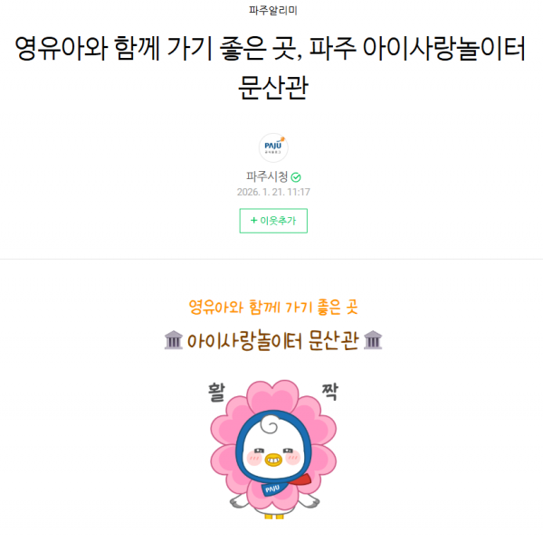 보도자료 영유아와 함께 가기 좋은 곳 '아이사랑놀이터 문산관' 페이지 정보 작성자 관리자 댓글 0건 조회 229회 작성일 26-02-10 09:26 목록 관련링크 https://m.blog.naver.com/paju_si/224154322452 126회 연결 본문 https://m.blog.naver.com/paju_si/224154322452 영유아와 함께 가기 좋은 곳, 파주 아이사랑놀이터 문산관 이전글2026년 3월 뉴스레터 26.02.27 다음글2026년 2월 뉴스레터 26.01.22