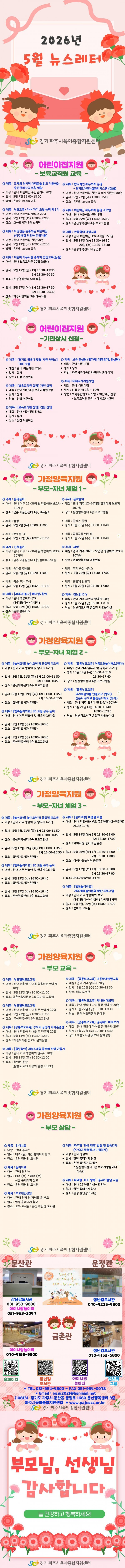 뉴스레터 2026년 5월 뉴스레터 페이지 정보 작성자 관리자 댓글 0건 조회 3회 작성일 26-04-27 15:14 목록 본문 2026년 5월 뉴스레터 다음글복합 돌봄 거점 조성 본격화 파주시, '세대통합 복합지원센터' 착공 26.04.10